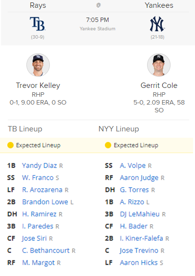 뉴욕양키스와 탬파베이 이번 대결 양팀 선발