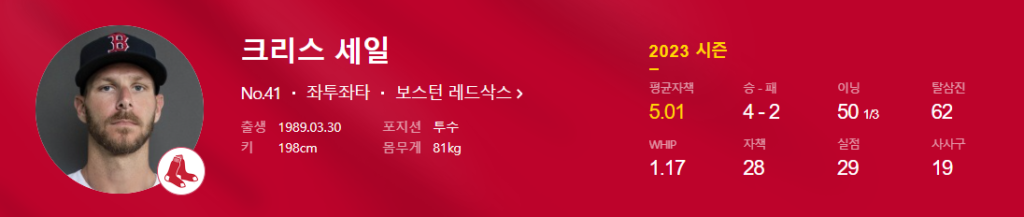 분들이라면 다들 알만한 투수 크리스세일 입니다