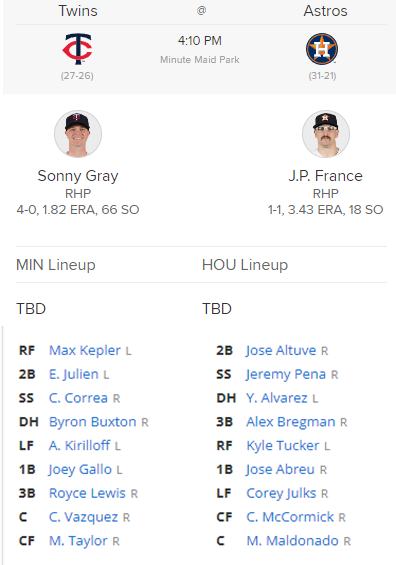 5월30일 휴스턴 VS 미네소타 분석 MLB 라인업