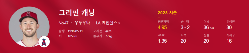원정팀 LA에인절스 투수는 그리핀 캐닝