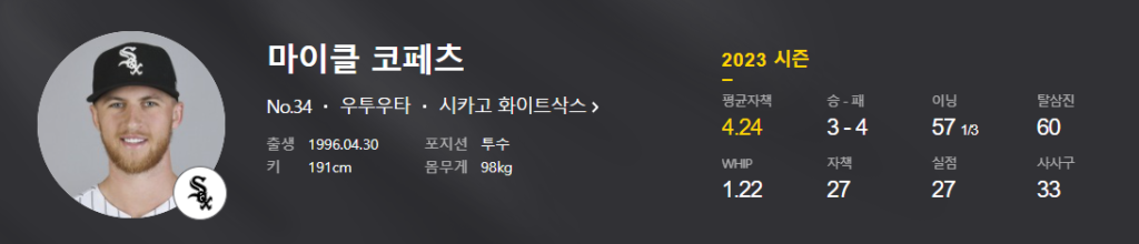 홈팀 시카고화이트삭스는 마이클 코페츠